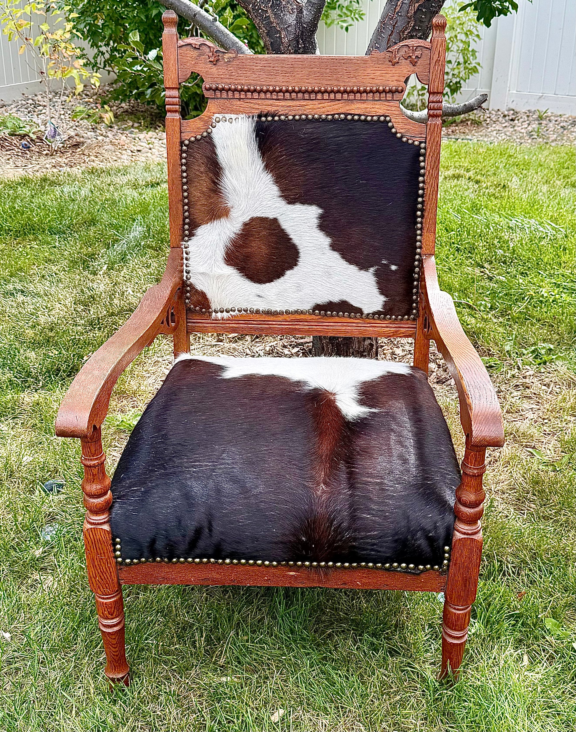 This stunning antique armchair has been lovingly restored and reupholstered in genuine cowhide, blending rustic Western charm with old-world elegance. The solid wood frame showcases beautiful carved detailing and warm natural grain, enhanced by hand-applied brass nailhead trim that outlines the hide’s organic pattern. The seat and back feature rich brown-and-white cowhide, adding both comfort and authentic character to this vintage piece.