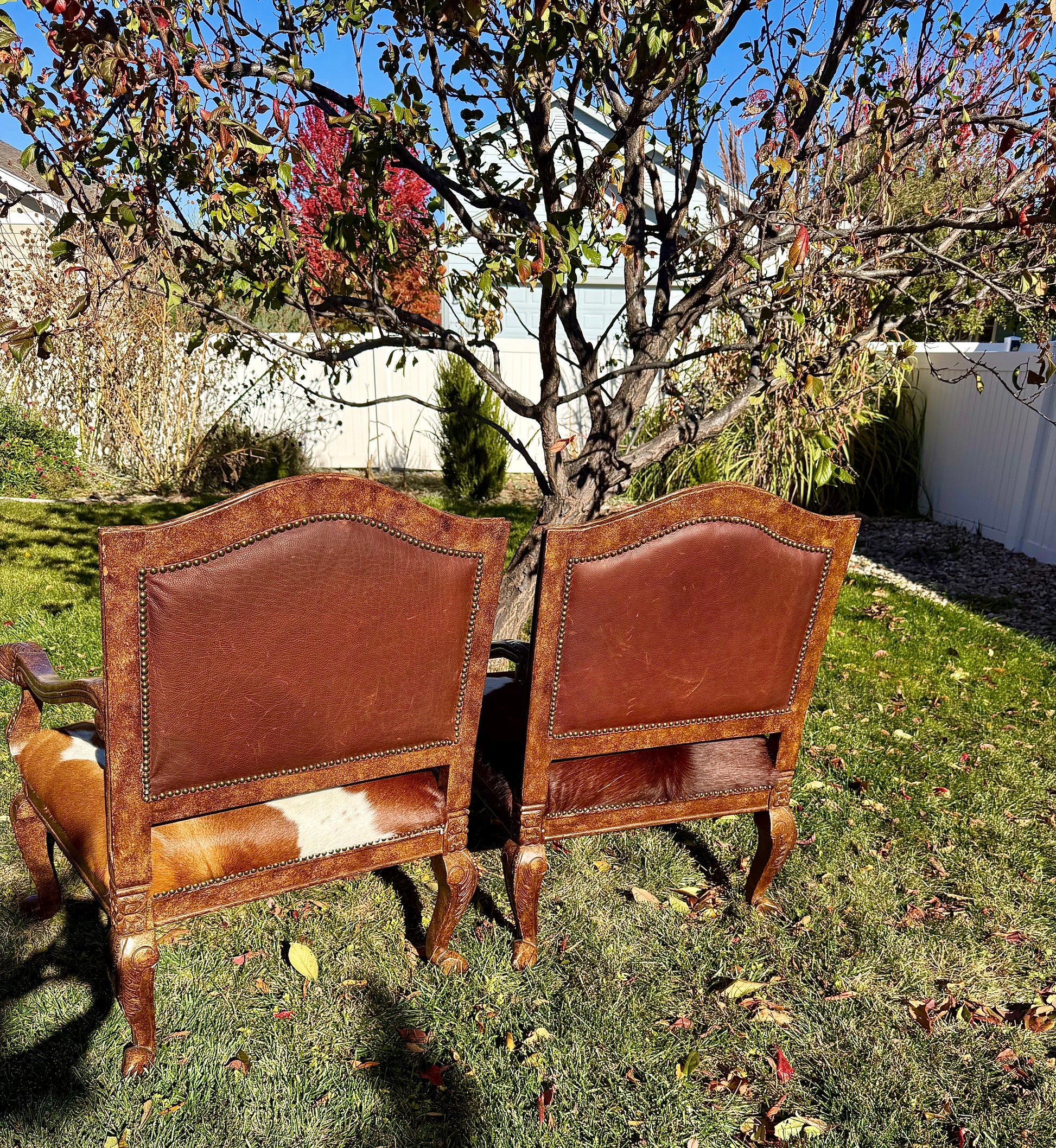 Newly reupholstered genuine cowhide and Pendleton chairs with leather backing and antique brass tacks!