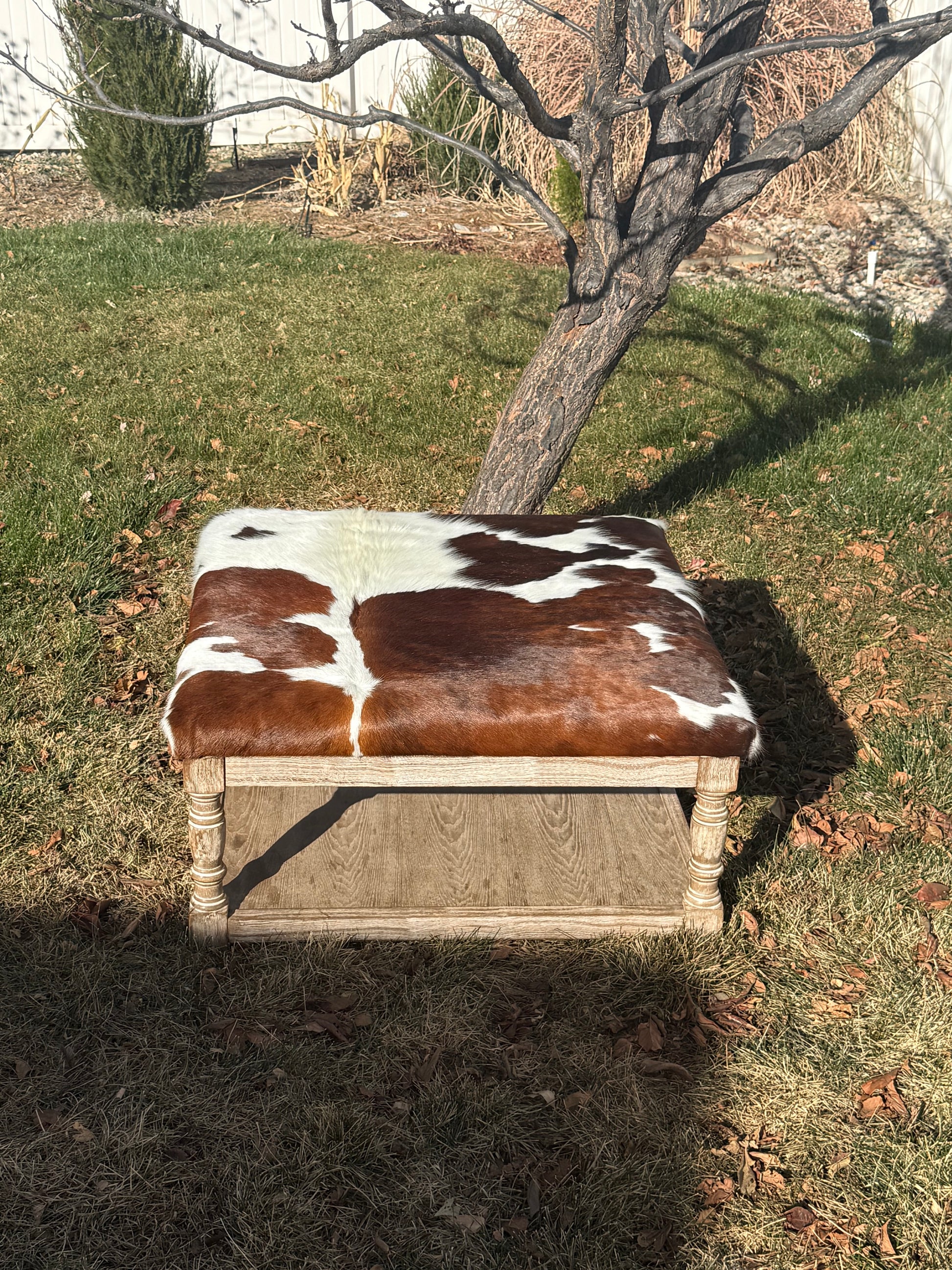Beautiful tricolor cowhide upholstered top paired with a rustic wood base. Perfect for adding western charm and extra storage to your living room, entryway, or bedroom.