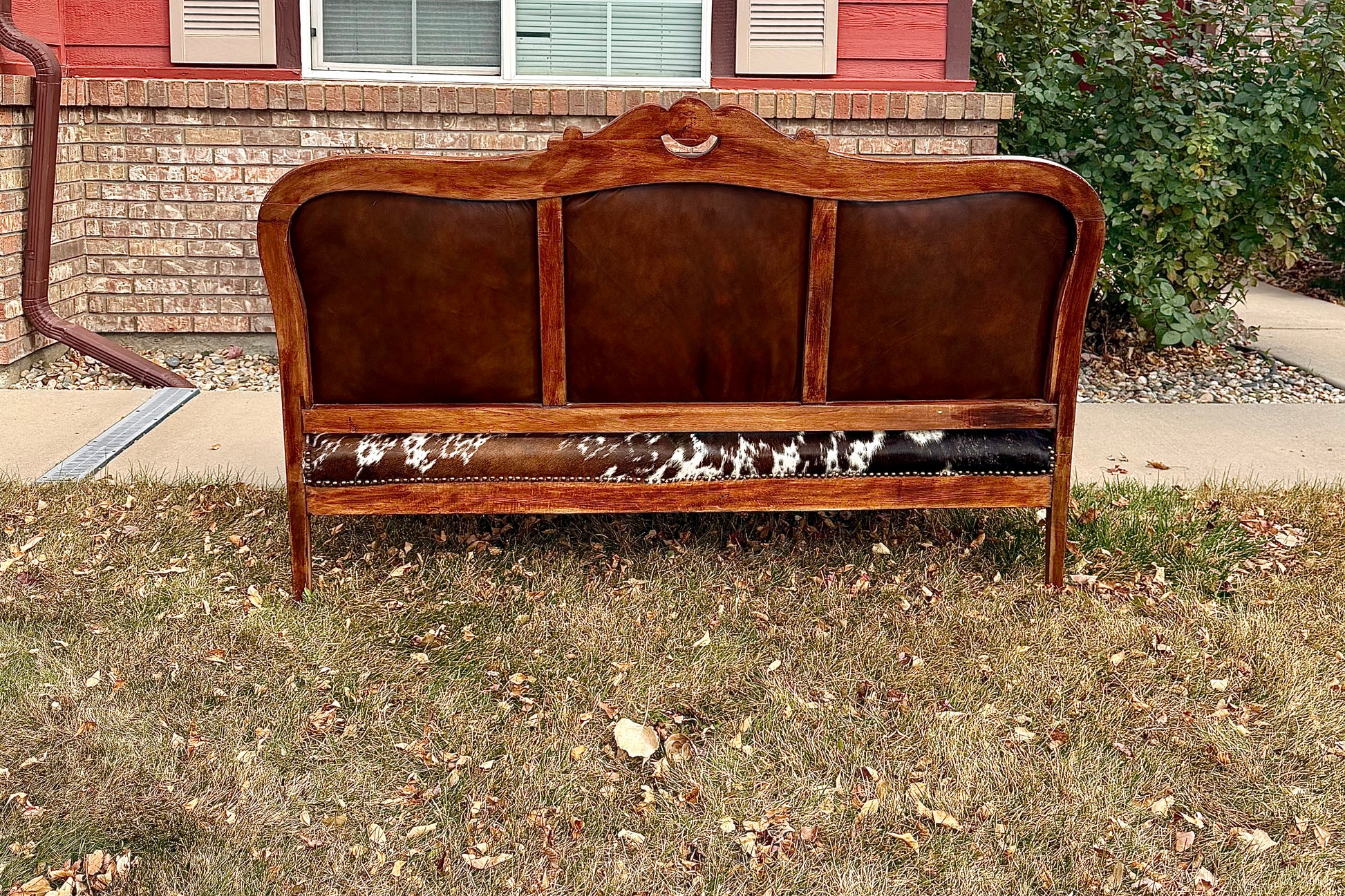 This stunning antique-style sofa has been fully reupholstered with premium hair-on cowhide on the front and rich brown leather on the back. Finished with hand-placed nailhead trim and a beautifully carved solid wood frame.